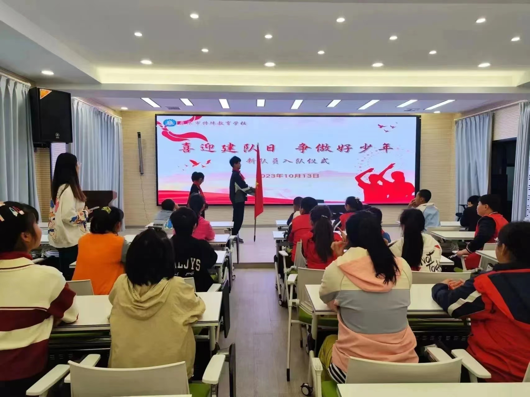 为提升学生的组织归属感和增强学生作为一名少先队员的光荣感,同时也为了进一步强化启东市特殊教育学校少先队组织建设,10月13日上午,启东市特殊教育学校在未来教室开展了“喜迎建队日,争做好少年”少先队入队仪式。